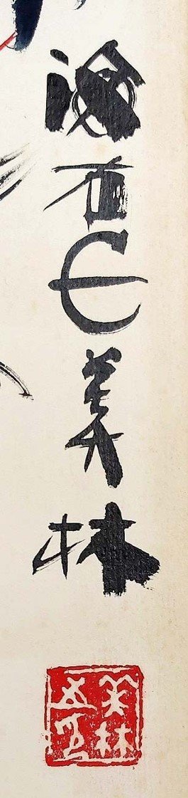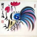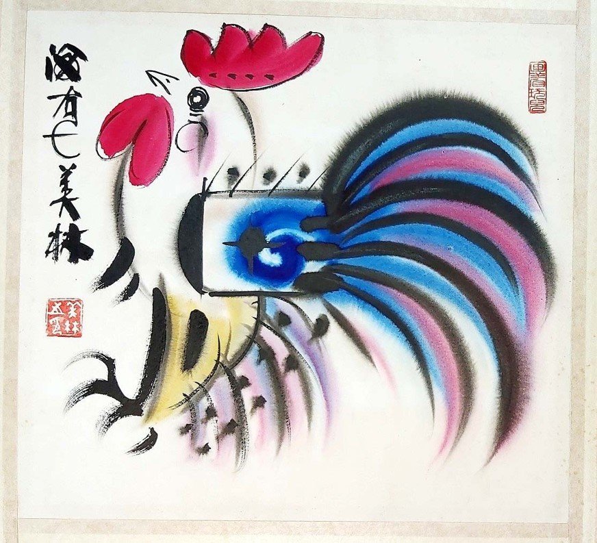 韓美林繪畫風格獨特,將寫實、誇張、抽象、寫意、工筆、印象等手法與中西藝術融為一體,強調濃烈裝飾性,汲取中國古代漢代及民間藝術精髓,形成「韓氏」視覺語言。以動物與人物為主,常用流暢弧線、直線概括形體,輔以墨色渲染皮毛質感,構圖簡潔有力(如倒三角構圖),色彩飽滿明快(大紅、亮黃、純藍對比),營造動態張力與層次感。水墨作品墨韻濃厚,線條粗細變化表現節奏;彩墨則惜色如金,融合水彩效果。代表作如《馬》、《虎》、《猴》、《雞》,展現天真爛漫與現代活力;生肖系列如2017年雞郵票,開創中國畫馬新格局。