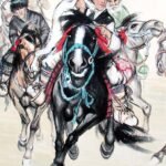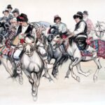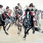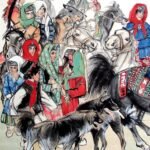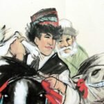 黃胄的繪畫風格融合傳統工筆與寫意,擅畫毛驢、駱駝、羊群等西北動物,筆墨豪放生動、氣韻流暢,極富動感與生活氣息,如巨幅《百驢圖》、《三駝圖》、《風雪夜歸人》成為其經典代表。他開創中國人物畫由速寫走向大尺幅自由創作的新路徑,作品如《趕集》、《人畜兩旺》、《蘋果花開的時候》、《送糧人》充滿西北風情與人文關懷,融合傳統筆墨與現代寫實手法;1957年《洪荒風雪圖》獲世界青年聯歡節金獎,1958年《趕集》獲銅獎,一舉奠定其在中國畫壇的地位。