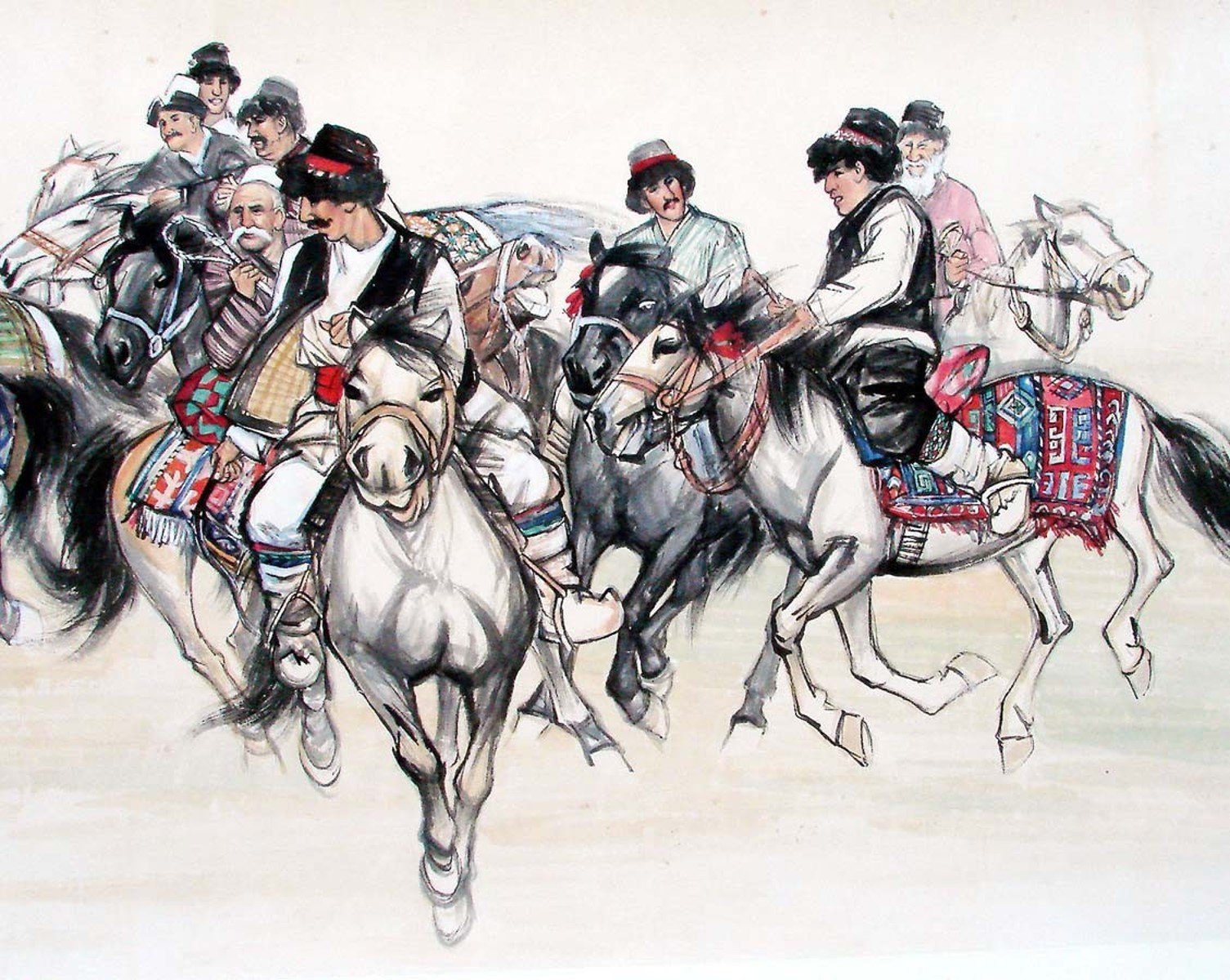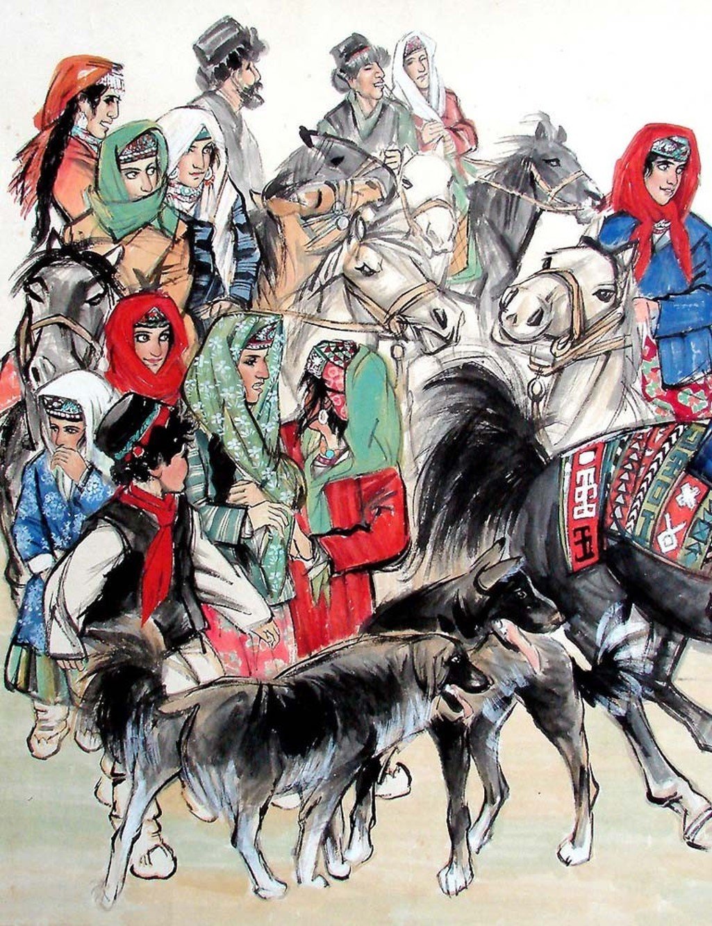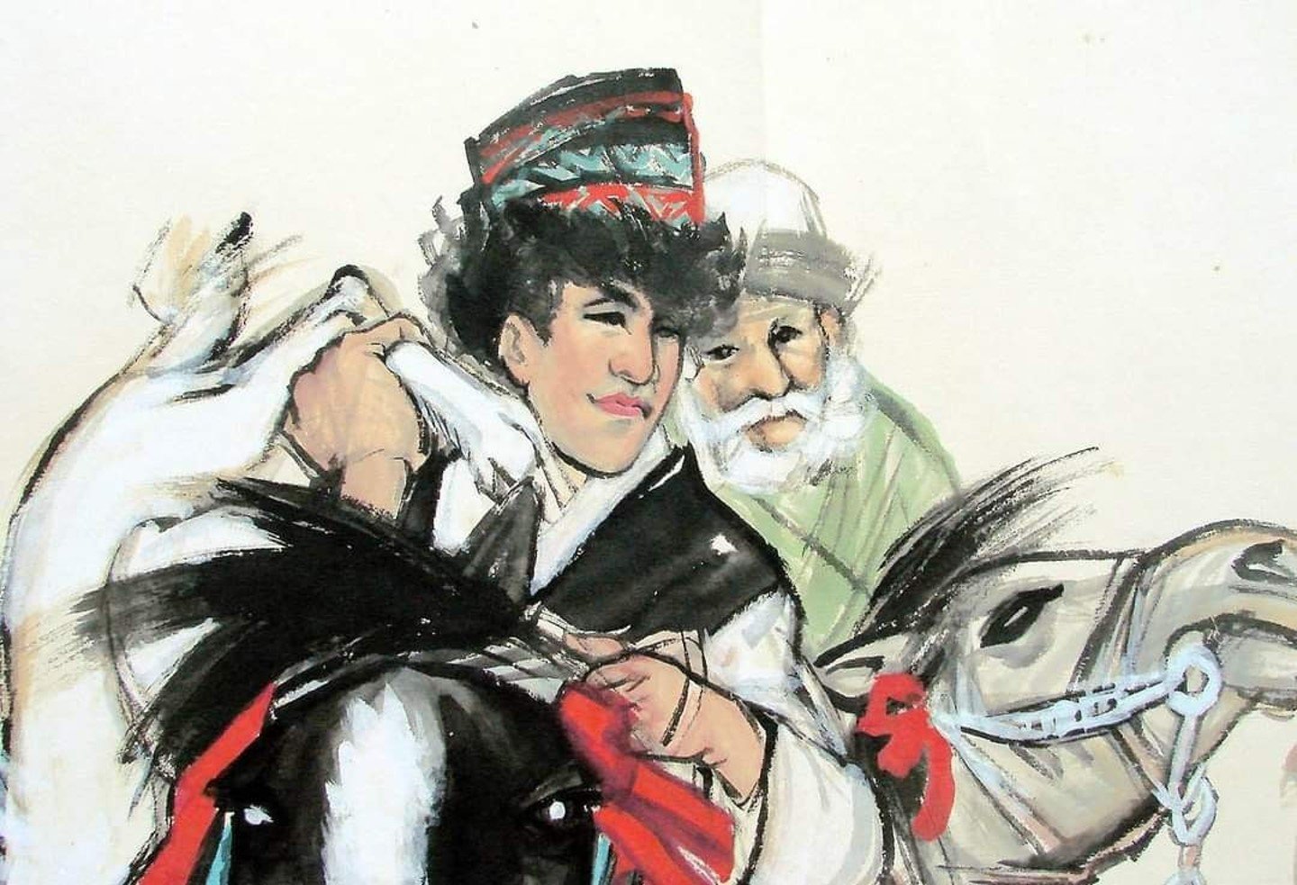 黃胄出生於河北蠡縣一個貧寒農家,自幼目睹民生疾苦,早年隨家人移居西安謀生。1940年,他師從長安畫派創始人趙望雲學習國畫,系統習得傳統水墨技法,並開始關注民間藝術與寫生實踐。1943年正式拜師後,他深入陝甘寧邊區及西北鄉村速寫寫生,記錄勞動人民的日常生活;1946年更赴河南黃泛區災區,創作大量反映災民苦難的漫畫、木刻與速寫作品,如《黃河遊擊隊》等,這些早期實地體驗為其後來寫實風格與西北題材奠定了堅實基礎。