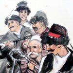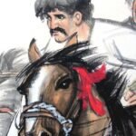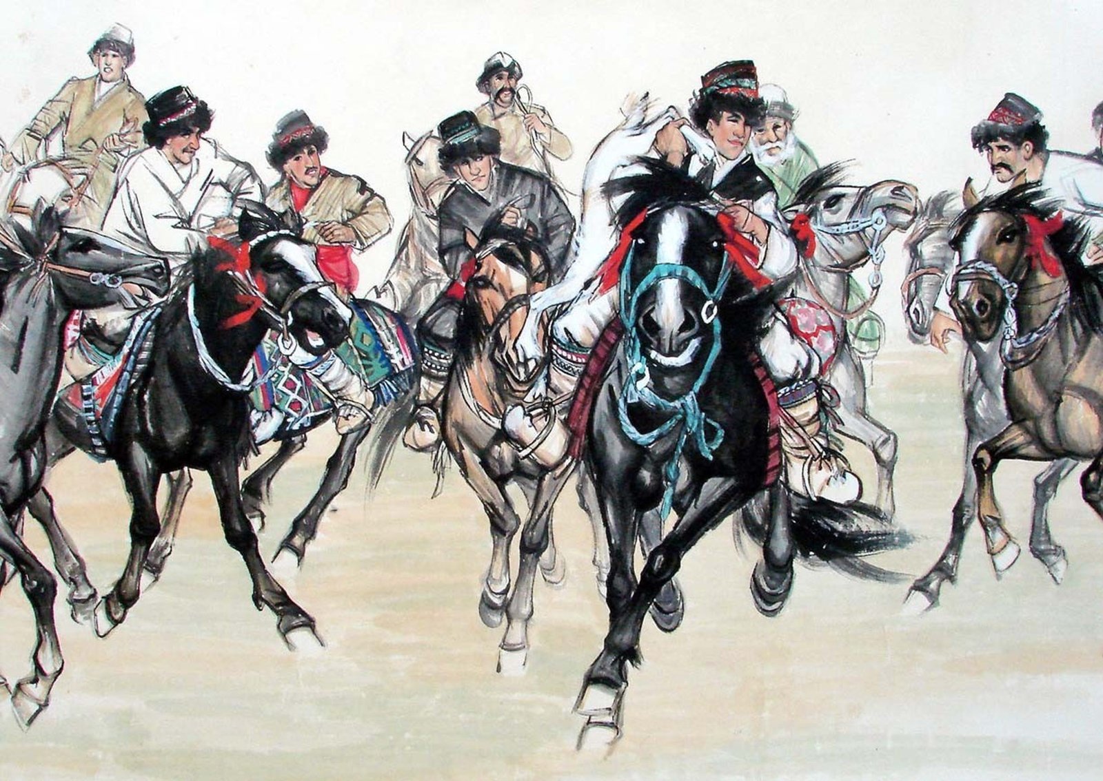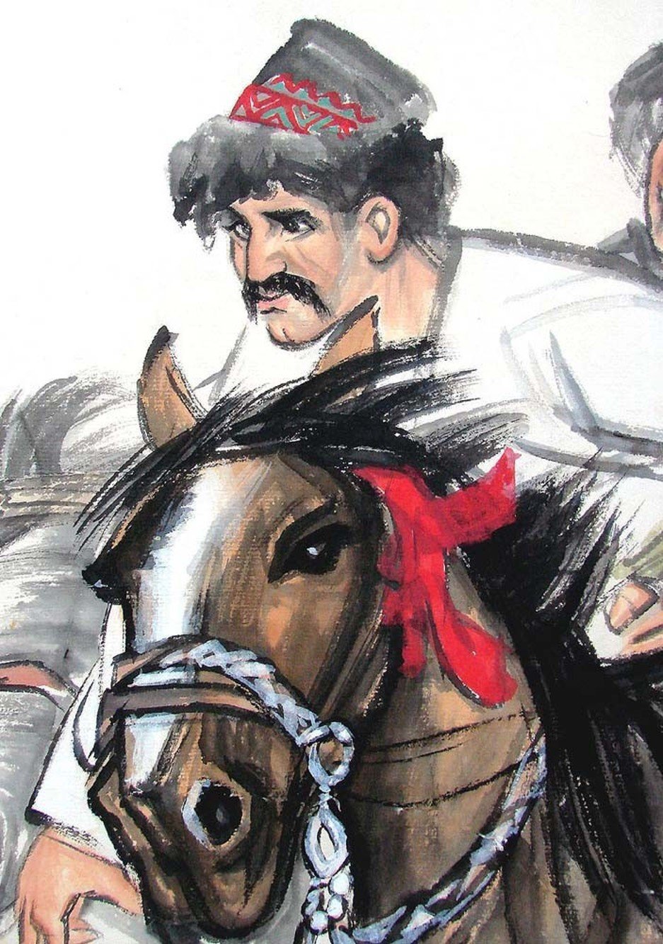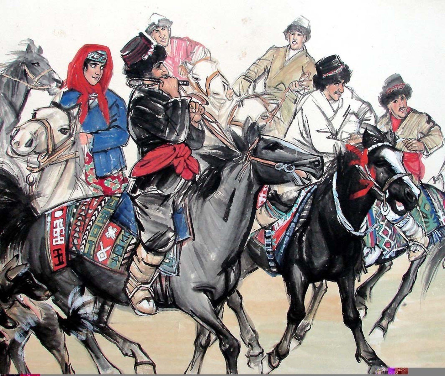 黃胄出生於河北蠡縣一個貧寒農家,自幼目睹民生疾苦,早年隨家人移居西安謀生。1940年,他師從長安畫派創始人趙望雲學習國畫,系統習得傳統水墨技法,並開始關注民間藝術與寫生實踐。1943年正式拜師後,他深入陝甘寧邊區及西北鄉村速寫寫生,記錄勞動人民的日常生活;1946年更赴河南黃泛區災區,創作大量反映災民苦難的漫畫、木刻與速寫作品,如《黃河遊擊隊》等,這些早期實地體驗為其後來寫實風格與西北題材奠定了堅實基礎。