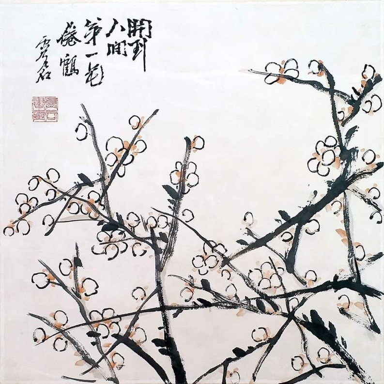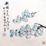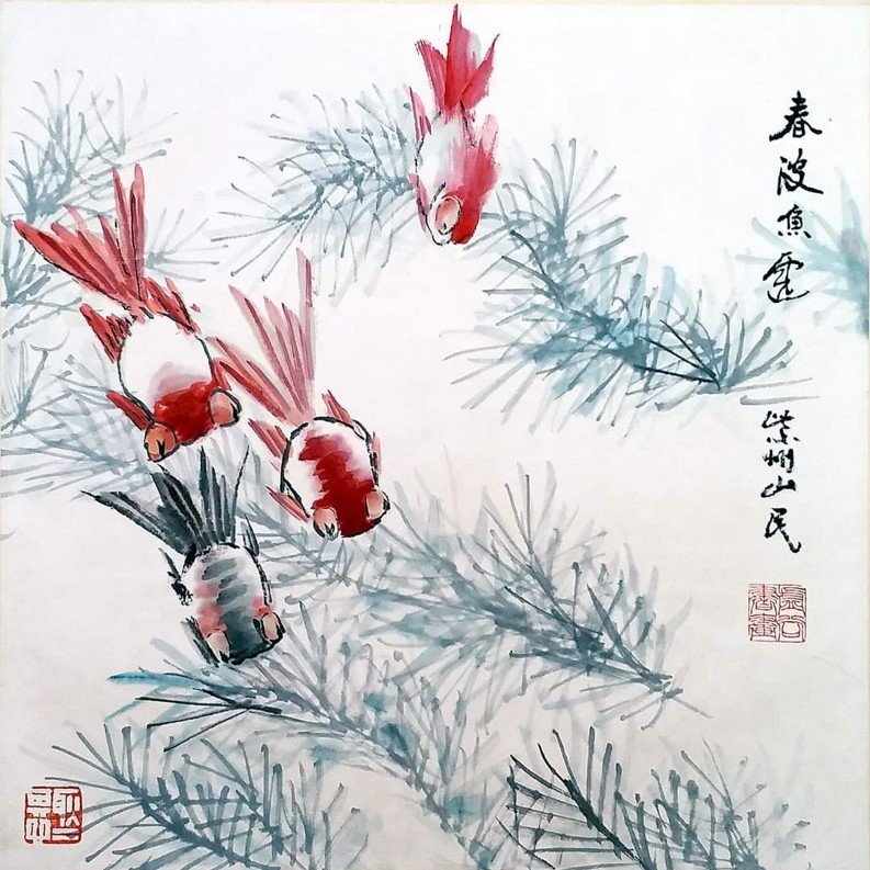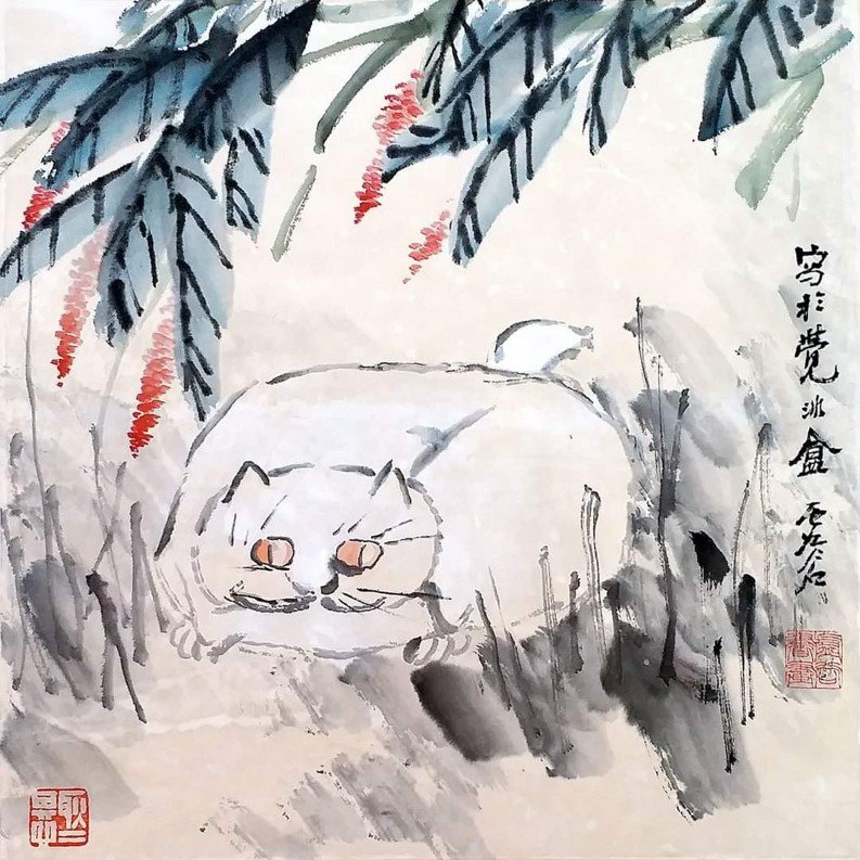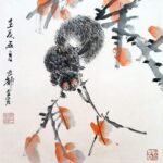 虛谷畫風獨樹一幟,冷峭奇崛、拙外秀內:用干筆偏鋒、焦墨破筆,線條枯瘦靈動、墨彩淡雅(偶用強烈對比色),造型概括生動無滯相,構圖平中求奇、虛實相生、空間浩大,花鳥蔬果充盈生命力,松鼠靈動攀枝、金魚悠遊水面、瓜果豐盈欲滴,營造生意盎然、蒼秀清新意境;山水界畫精工寫實,融合傳統與現實,如《重建光福寺全景圖》細膩層疊。章法大膽欹側、散點透視,畫詩書印合一,提升哲思深邃。代表作《梅花金魚圖》梅枝疏朗金魚遊弋、《松菊圖》蒼勁古拙、《紫藤金魚》繁花垂瀉生機勃勃、《蕙蘭靈芝圖》清雅脫俗、《枇杷圖》果實飽滿,與西方印象派塞尚、莫內有異曲同工,革新清末花鳥格局。